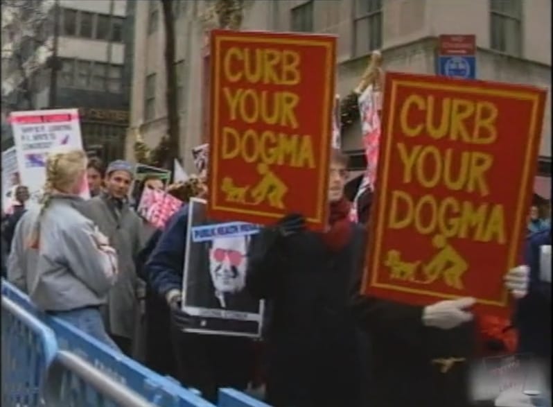 Protesters hold signs outside St. Patrick’s Cathedral as part of ACT UP’s Stop the Church action. From the ACT UP Oral History Project