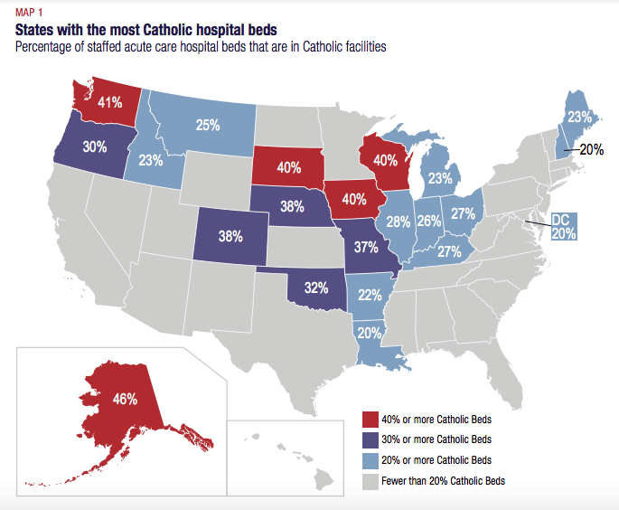 The Catholic Health Association claims that one in seven patients in the U.S. go through their hospitals. A 2020 report from Community Catalyst found that in plenty of states, their systems make up a substantial percentage of all hospitals. This is not just something that impacts Catholics, nor only red states. Almost a third of all hospital beds in Oregon are run by the church. In Washington, it's over 40 percent, as it is throughout much of the Midwest.